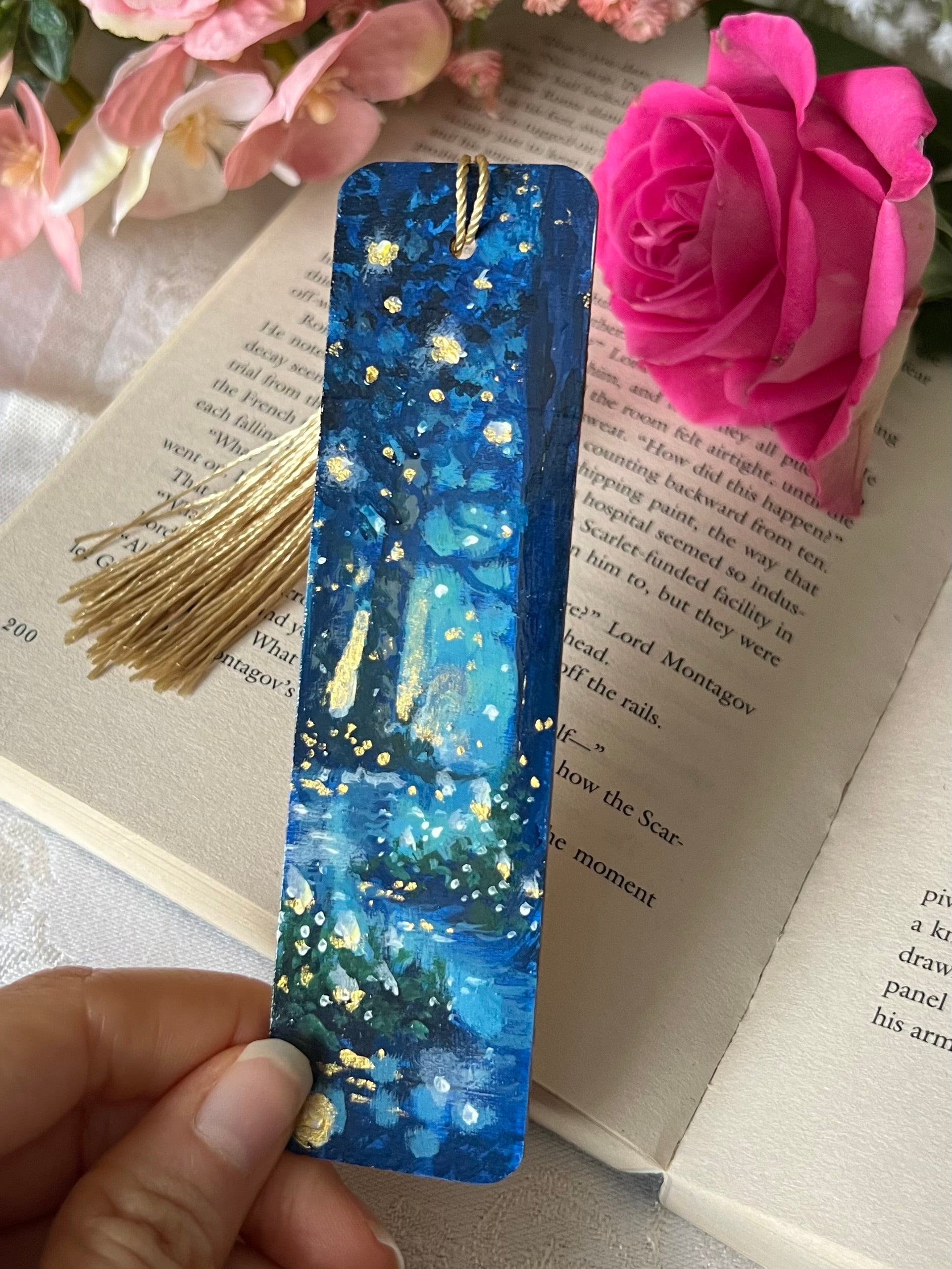 This is a wooden, hand painted bookmark, embellished with golden metallic paint, and varnished for protection. :)